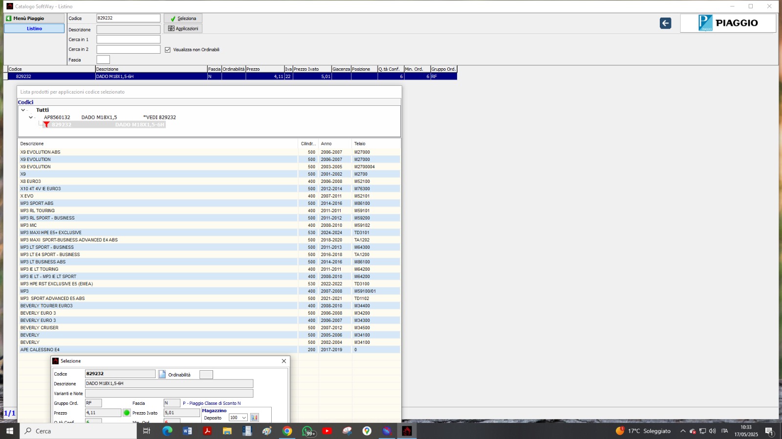 829232 DADO M18X1.5-6H ORIGINALE PIAGGIO